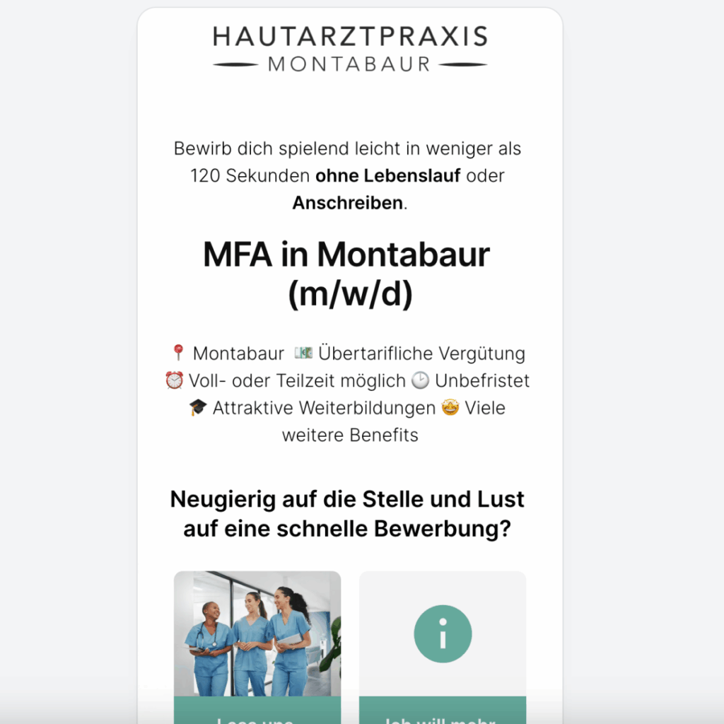 Für die Praxis wurde zunächst die Arbeitgeberpositionierung ausgearbeitet. Anschließend wurden die Recruiting-Kampagne sowie eine Bewerberseite mit vorqualifizierenden Fragen eingerichtet, damit passende Bewerbungen schnell und unkompliziert eingehen konnten.
